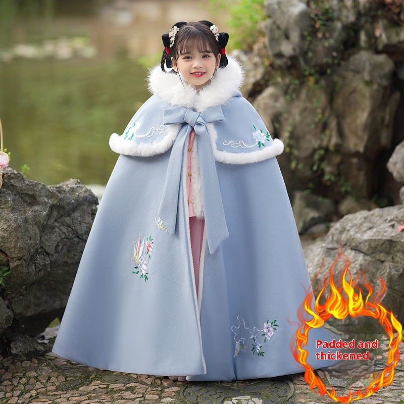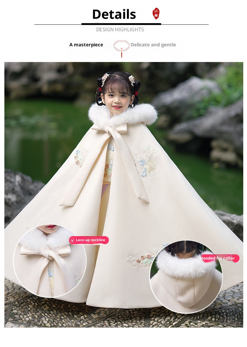 Girls' Winter Hanfu Cloak with Fur Collar Hooded Fairy Cape