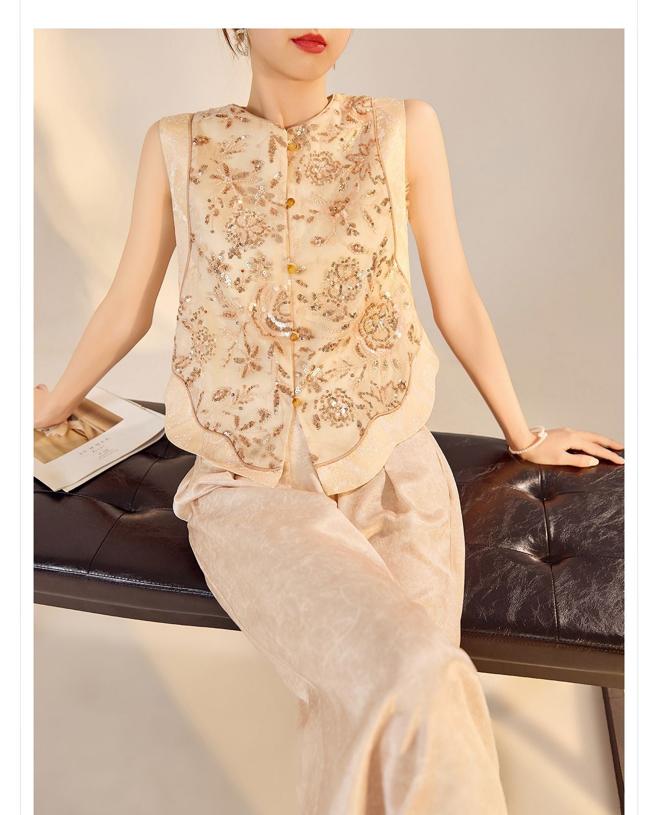 National Style2025Summer New Beaded Embroidery New Chinese Style Sequin Mermaid Skirt Vest Pants Set
