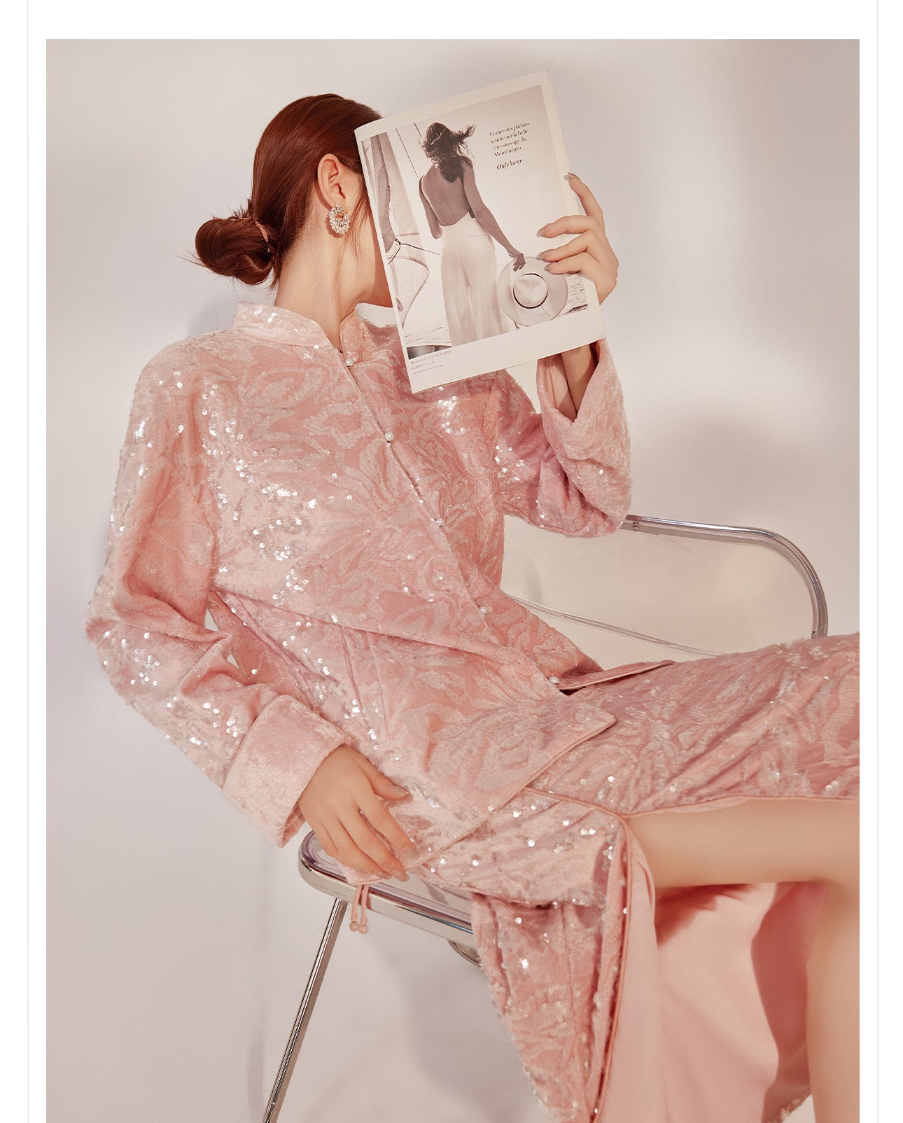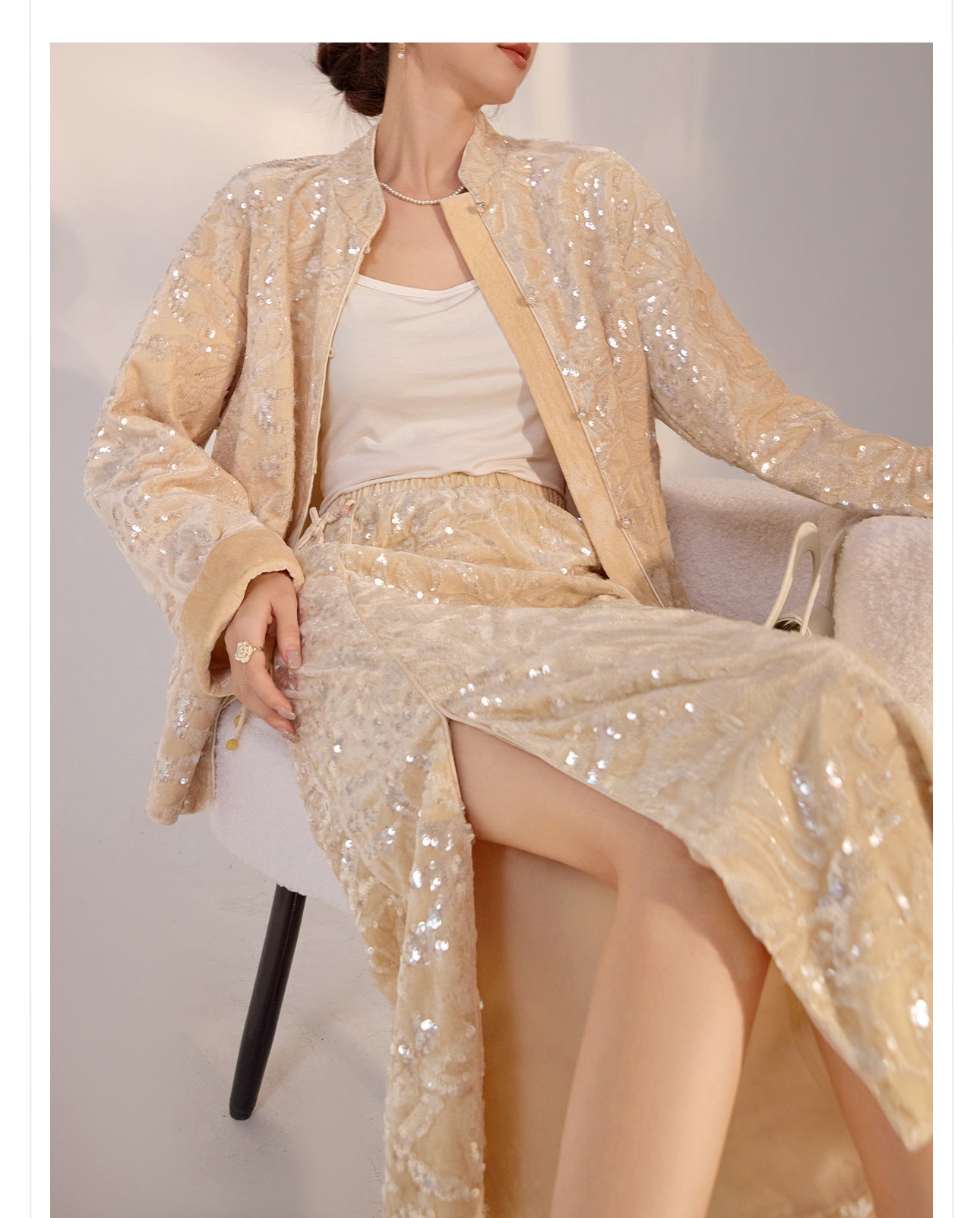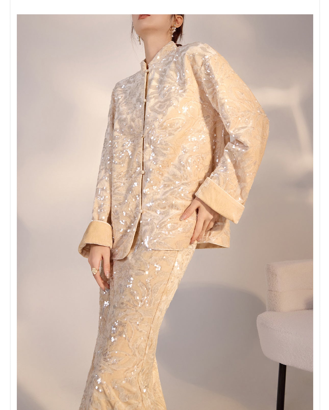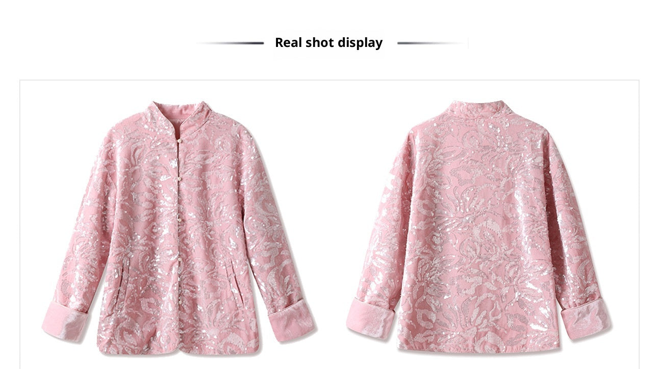 New Chinese Satin Floral Sequin Button Light Luxury Loose Coat
