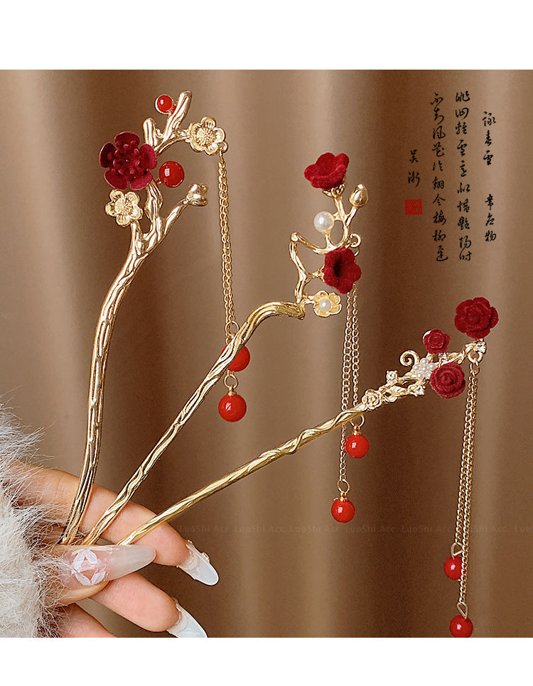 Velvet Rose Hairpin | Elegant Chinese Style Ancient Tassel Ornament