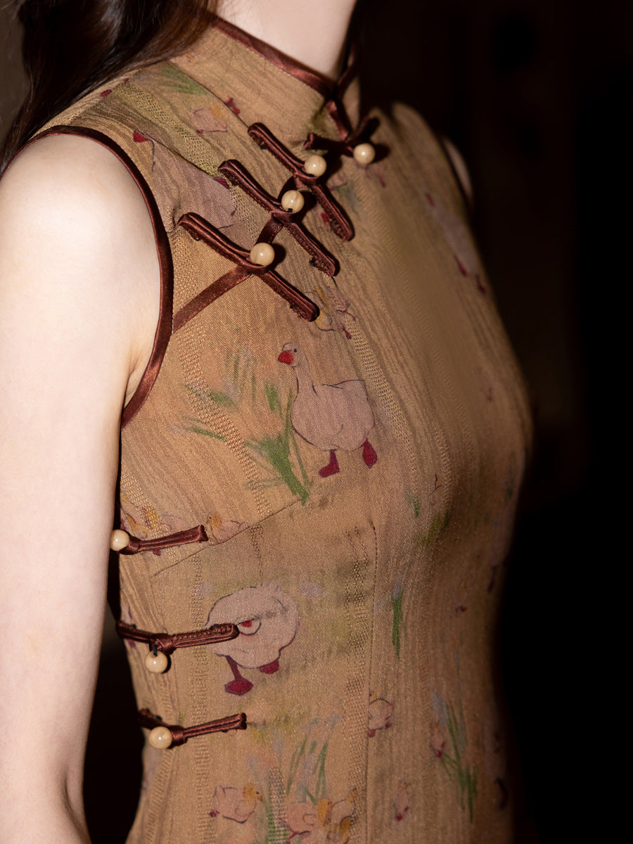Spring Wild Duck Yellow Cheongsam – Youth Slim Sleeveless Dress
