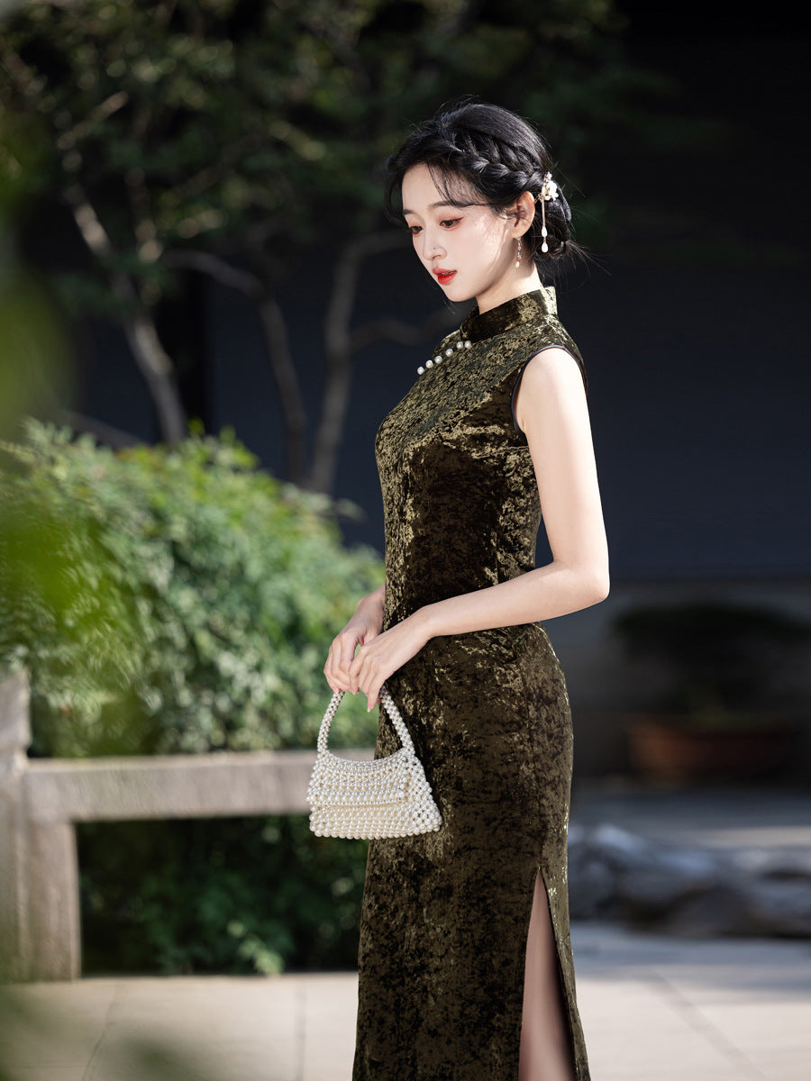 New Chinese Style Black Velvet Cheongsam – Slim Fit Dress